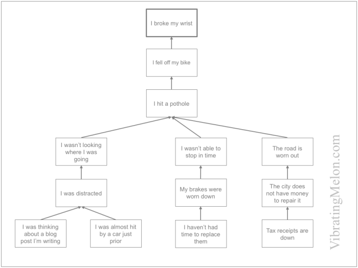 Let’s use a contrived example for illustration. Imagine that I fell off my bike and broke my wrist. We start on the whiteboard with the impact – i.e. I broke my wrist.