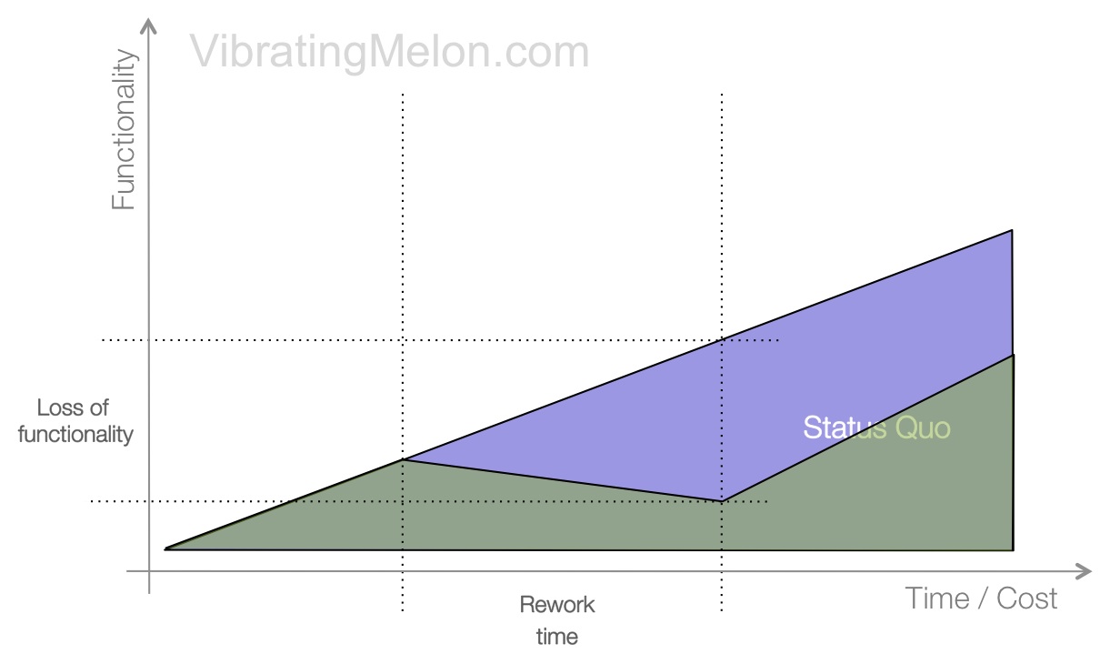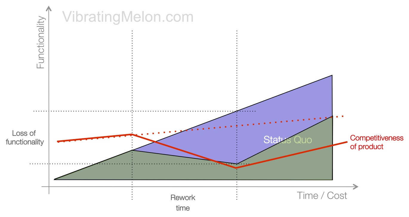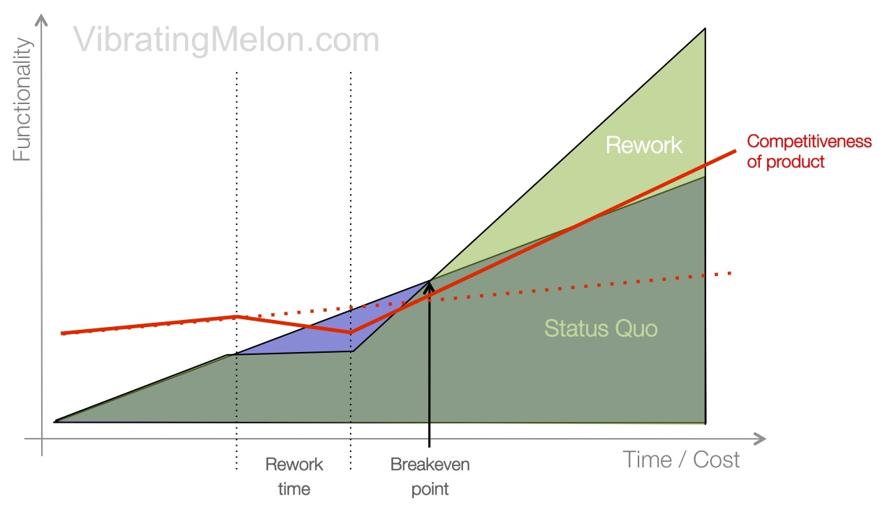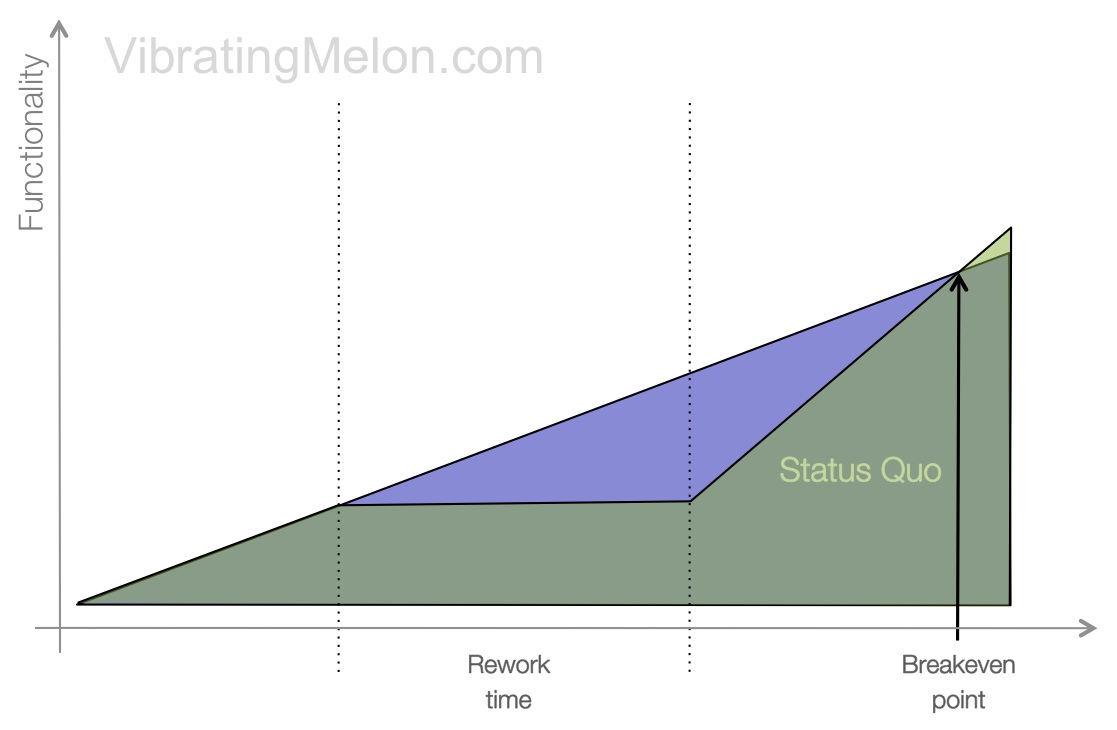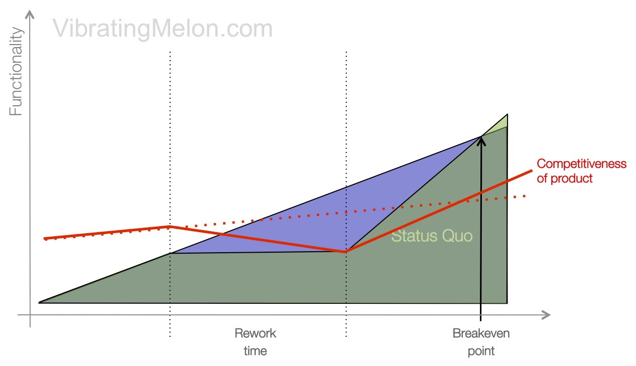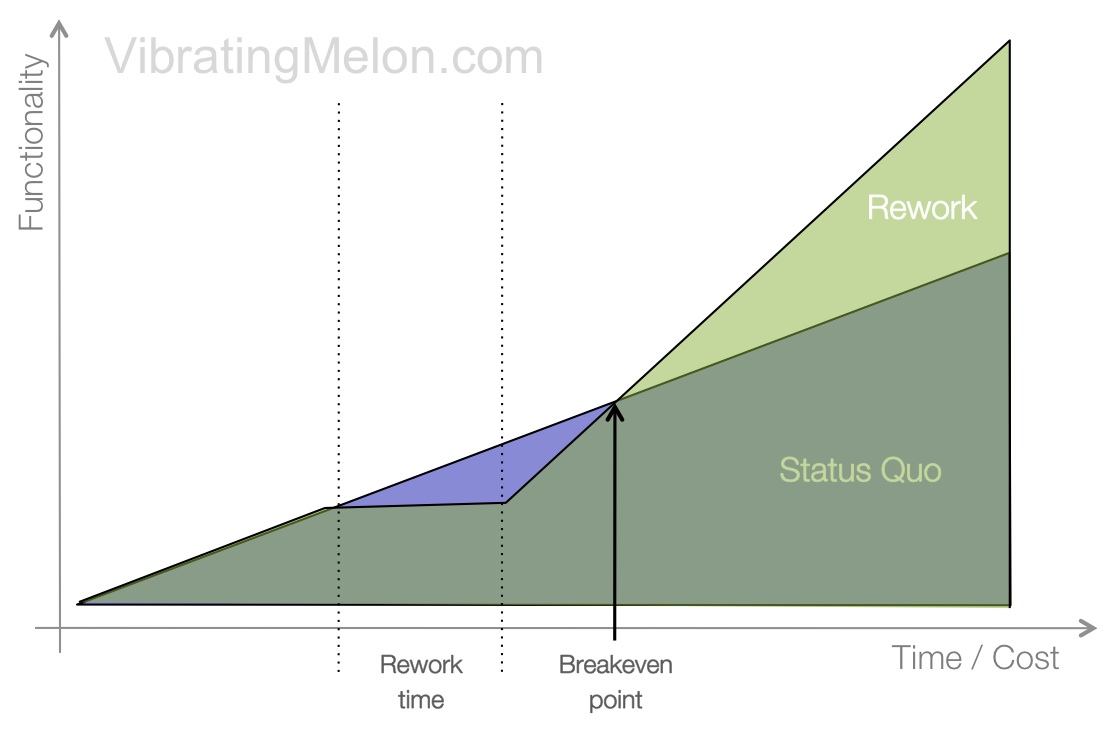 The critical point in time is the break-even point – this is the point at which the functionality of your product starts to exceed where you would have been had you stuck with the original implementation and continued working on it.