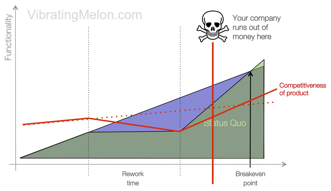 If you are a big company, you can probably (hopefully) absorb the pushed out break-even point – maybe other products provide revenue, maybe good channel relationships continue to deliver sales of your product even though it’s falling versus the competition or maybe you’ve simply got lots of cash reserves.  Joel Spolsky references several big company rewrites that failed but did not kill the company.